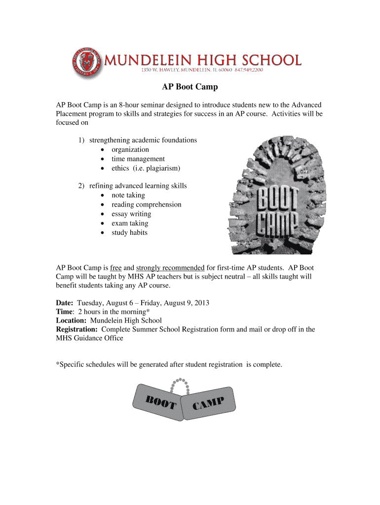 AP Boot Camp AP Boot Camp is an 8-hour seminar designed to introduce students new to the Advanced Placement program to skills and strategies for success in an AP course. Activities will be focused