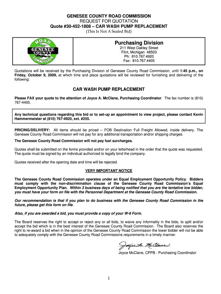 GENESEE COUNTY ROAD COMMISSION REQUEST FOR QUOTATION Quote #304521808 CAR WASH PUMP REPLACEMENT (This Is Not A Sealed Bid) Purchasing Division 211 West Oakley Street Flint, Michigan 48503 pH: 810.767.4920