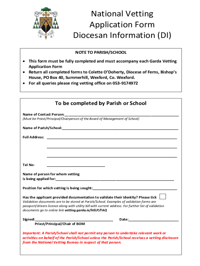 National Vetting Application Form Diocesan Information (DI) NOTE TO PARISH/SCHOOL This form must be fully completed and must accompany each Garza Vetting Application Form Return all completed forms