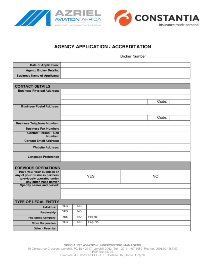 AGENCY APPLICATION / ACCREDITATION Broker Number Date of Application: Agent / Broker Details: Business Name of Applicant:CONTACT DETAILS Business Physical Address:Code: Business Postal Address:Code: