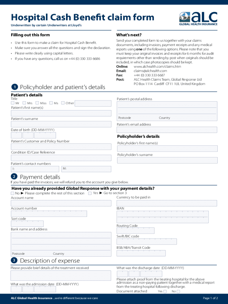 Hospital Cash Benefit claim form Underwritten by certain Underwriters at LloydsFilling out this formats next? Use this form to make a claim for Hospital Cash Benefit. Make sure you answer all the