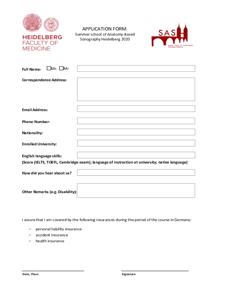 APPLICATION FORM Summer school of AnatomyBased Sonography Heidelberg 2020Full Name:MsMrCorrespondence Address:Email Address: Phone Number:Nationality: Enrolled University: English language skills:(Score