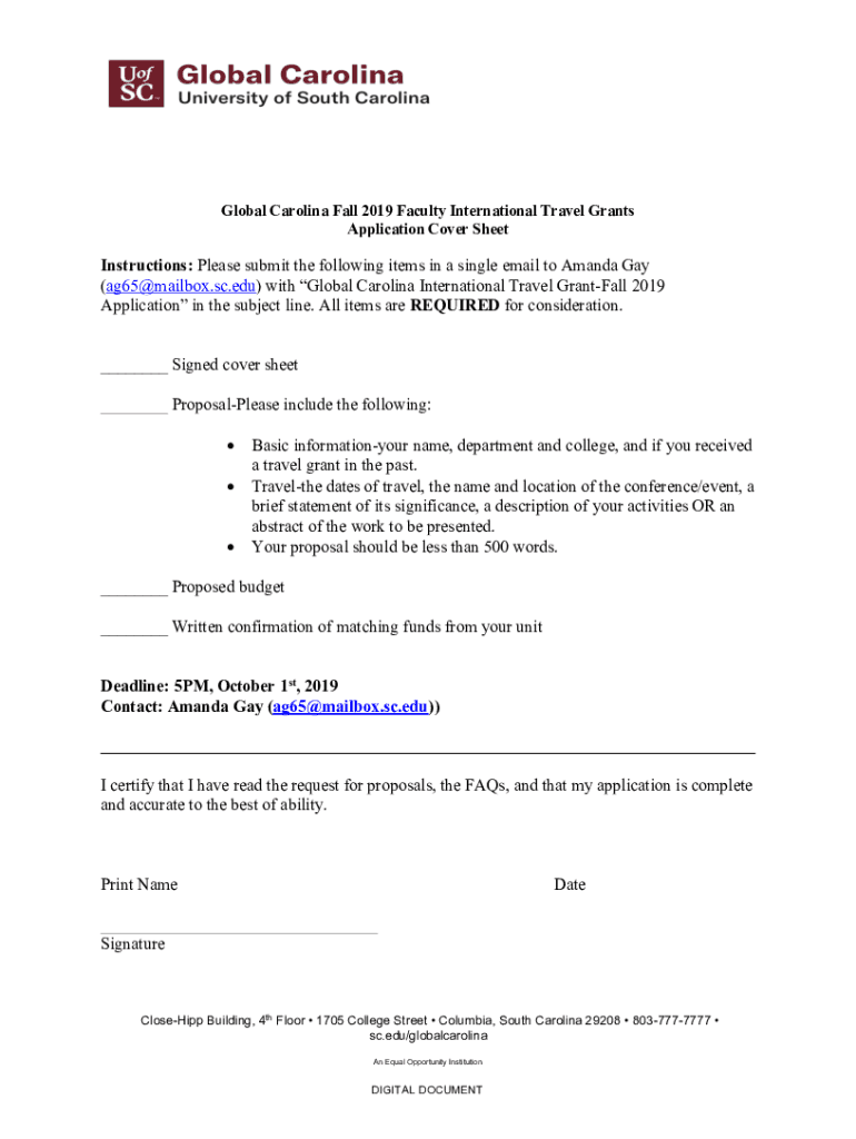 Global Carolina Fall 2019 Faculty International Travel Grants Application Cover SheetInstructions: Please submit the following items in a single email to Amanda Gay (ag65 mailbox.SC.edu) with Global