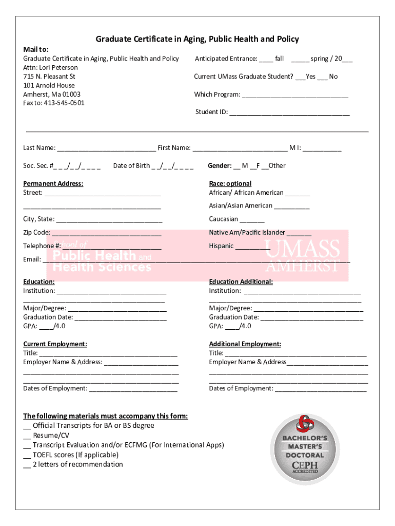 Mail to:Graduate Certificate in Aging, Public Health and PolicyGraduate Certificate in Aging, Public Health and Policy Attn: Lori Peterson 715 N. Pleasant St 101 Arnold House Amherst, Ma 01003 Fax
