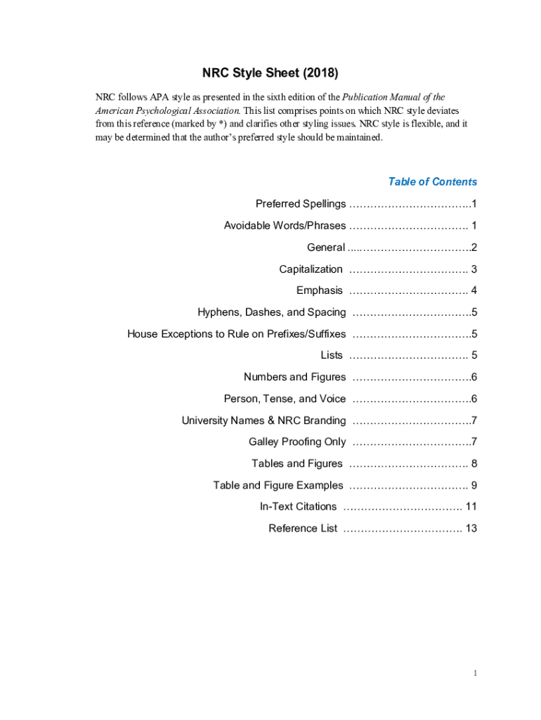 NRC Style Sheet (2018) NRC follows APA style as presented in the sixth edition of the Publication Manual of the American Psychological Association. This list comprises points on which NRC style deviates