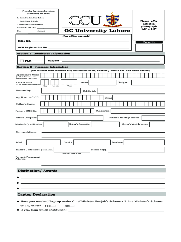 Processing Fee submission options: (Choose only one option)1. Bank Chillán, GCU Lahore Bank Name & Code: 2. Bank Draft/ Demand Draft Chillán/ BD/ DD No. GC University Laureate Amount Please affix