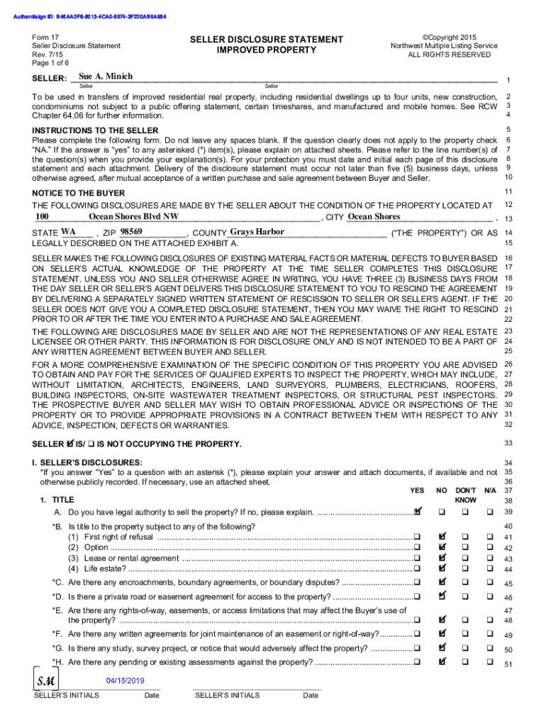 Authenticity ID: B46AA3F680134CA089743F220AB9A984SELLER DISCLOSURE STATEMENT IMPROVED PROPERTYForm 17 Seller Disclosure Statement Rev. 7/15-Page 1 of 6Copyright 2015 Northwest Multiple Listing Service