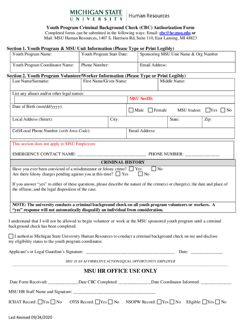 Youth Program Criminal Background Check (CBC) Authorization Form Completed forms can be submitted in the following ways: Email: CBC hr.MSU.edu or Mail: MSU Human Resources, 1407 S. Harrison Rd, Suite