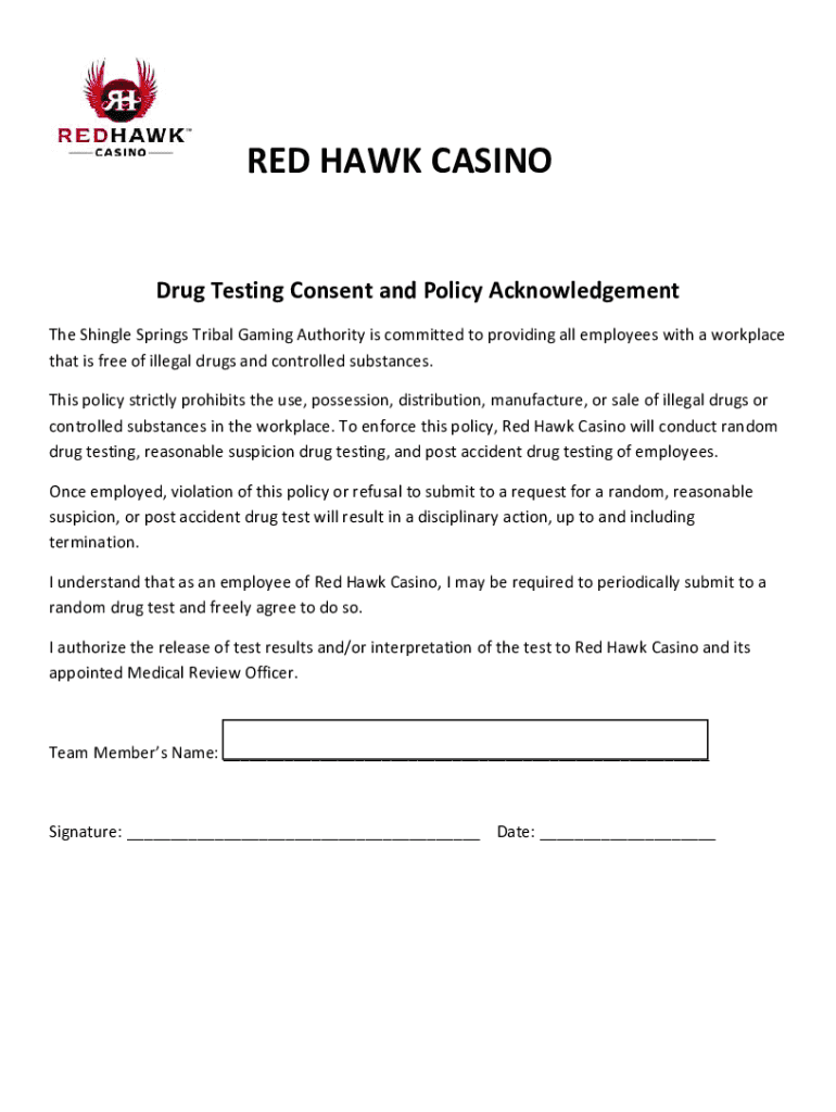 REDHAWKCASINO DrugTestingConsentandPolicyAcknowledgement TheShingleSpringsTribalGamingAuthorityiscommittedtoprovidingallemployeeswithaworkplace thatisfreeofillegaldrugsandcontrolledsubstances. Thispolicystrictlyprohibitstheuse,