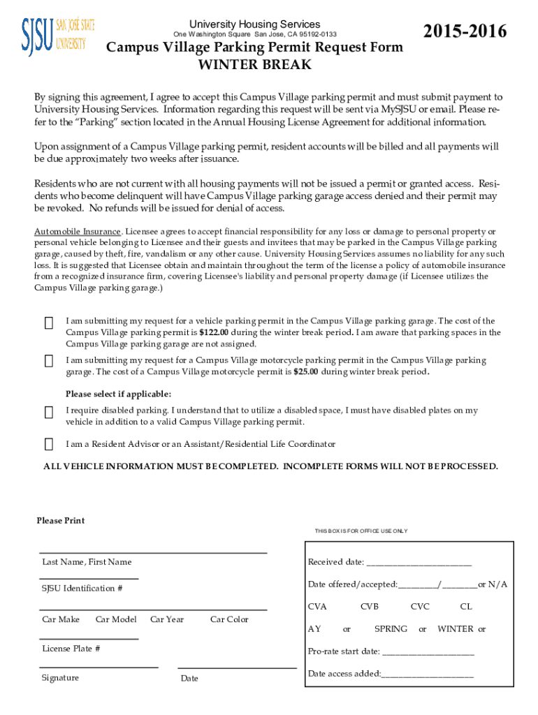 One Washington Square San Jose, CA 951920133Campus Village Parking Permit Request Form