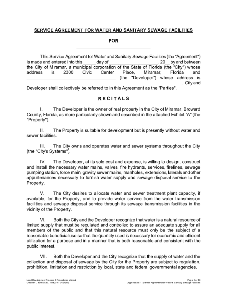 SERVICE AGREEMENT FOR WATER AND SANITARY SEWAGE FACILITIES FOR This Service Agreement for Water and Sanitary Sewage Facilities (the “Agreement “) is made and entered into this day of, 20 by and