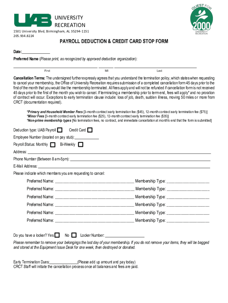 UNIVERSITY RECREATION 1501 University Blvd, Birmingham, AL 352941151 205.934.8224PAYROLL DEDUCTION & CREDIT CARD STOP Format: Preferred Name (Please print, as recognized by approved deduction organization):