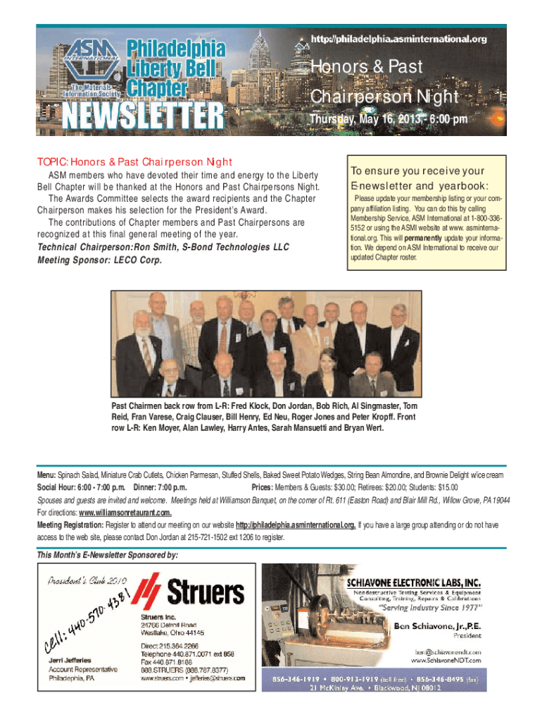 Honors & Past Chairperson Night Thursday, May 16, 2013 6:00 pm TOPIC: Honors & Past Chairperson Night ASM members who have devoted their time and energy to the Liberty Bell Chapter will be thanked