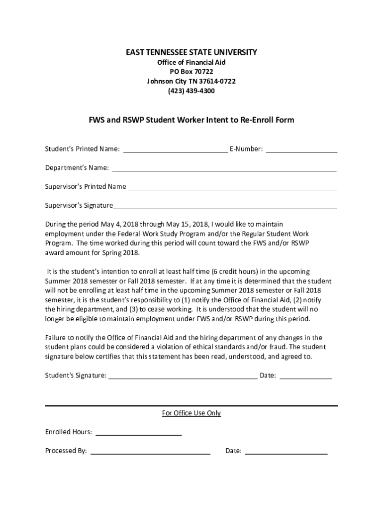 EAST TENNESSEE STATE UNIVERSITY Office of Financial Aid PO Box 70722 Johnson City TN 376140722 (423) 4394300FWS and RSP Student Worker Intent to Enroll Form Students Printed Name: Number: Departments