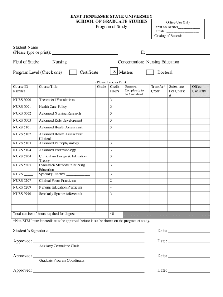EAST TENNESSEE STATE UNIVERSITY SCHOOL OF GRADUATE STUDIES Office Use Only Program of Study Input on Banner Initials: Catalog of Record: Student Name (Please type or print): Field of Study:E: NursingProgram