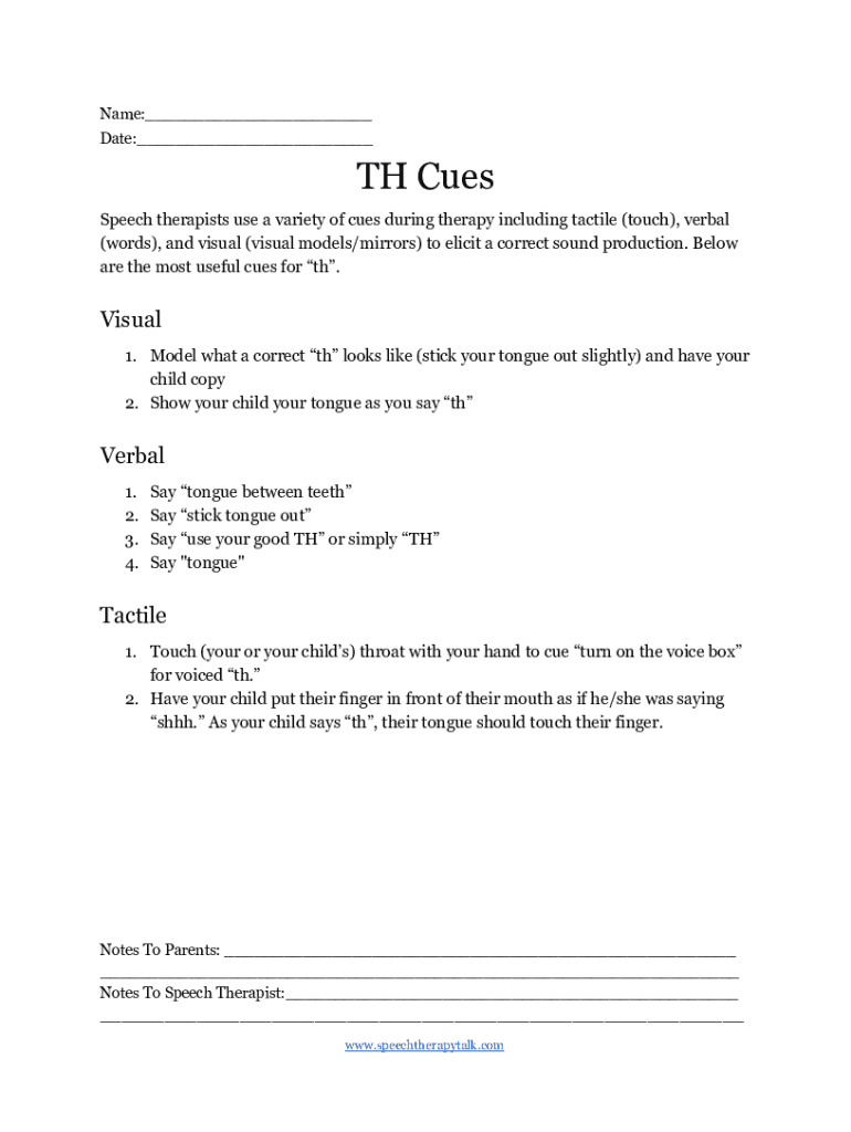 Name: Date: TH Cues Speech therapists use a variety of cues during therapy including tactile (touch), verbal (words), and visual (visual models/mirrors) to elicit a correct sound production. Below