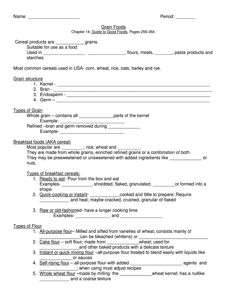 Name: Period: Grain Foods Chapter 14 Guide to Good Foods, Pages 256264. Cereal products are grains. Suitable for use as food Used in, flours, meals, pasta products and starches Most common cereals