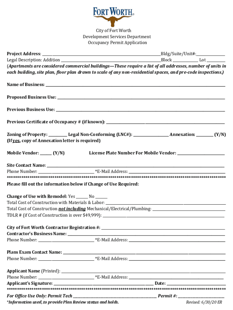 City of Fort Worth Development Services Department Occupancy Permit ApplicationProject Address: Bldg/Suite/Unit#: Legal Description: Addition Block Lot (Apartments are considered commercial buildingsThese