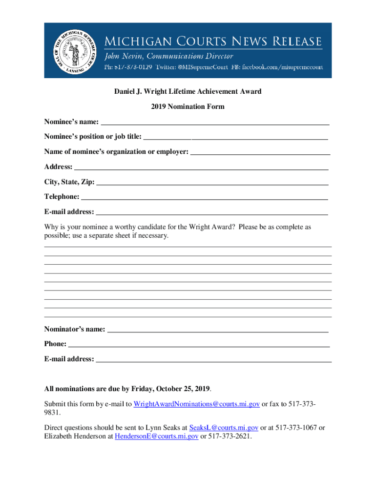 Get the free Nominations sought for Daniel J. Wright Lifetime Achievement ... - courts michigan