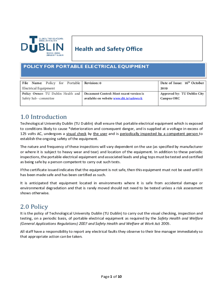 Health and Safety Office POLICY FOR PORTABLE ELECTRICAL EQUIPMENT File Name: Policy for Portable Revision: 0 Electrical EquipmentDate of Issue: 16th October 2019Policy Owner: TU Dublin Health and