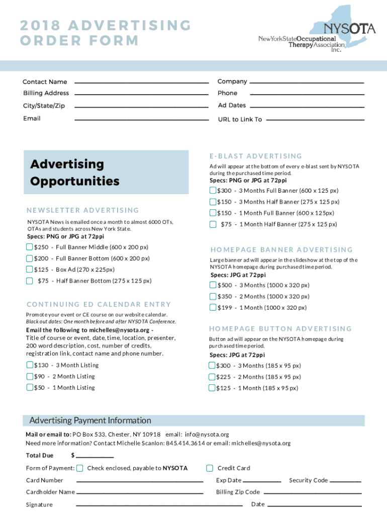 2018 ADVERTISING ORDER FORM Contact Name CompanyBilling AddressPhoneCity/State/iPad DatesEmailURL to Link Advertising OpportunitiesEBLAST ADVERTISING Ad will appear at the bottom of every blast sent