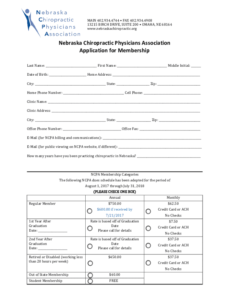 MAIN 402.934.4744 FAX 402.934.4908 13215 BIRCH DRIVE, SUITE 200 OMAHA, NE 68164www.nebraskachiropractic.orgNebraskaChiropracticPhysiciansAssociation ApplicationforMembership Last Name: First Name: