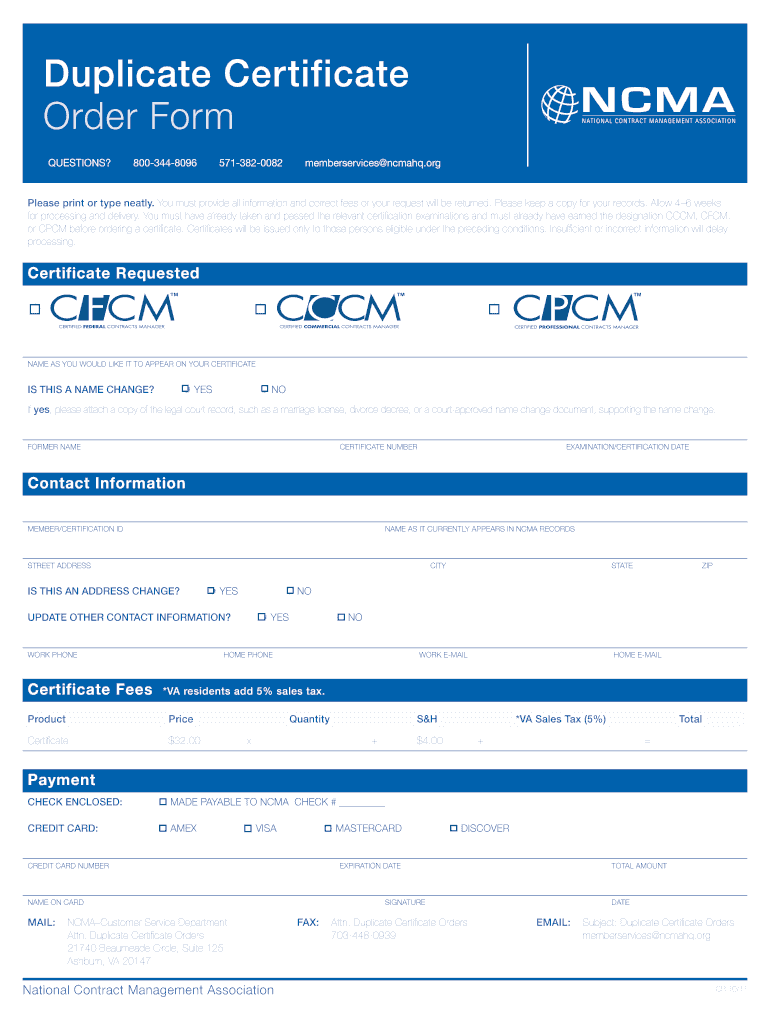 Anyone who has already earned the CCCM, CFCM, or CPCM designations is eligible to use the NCMA Duplicate Certificate Order Form to request a replacement certificate.