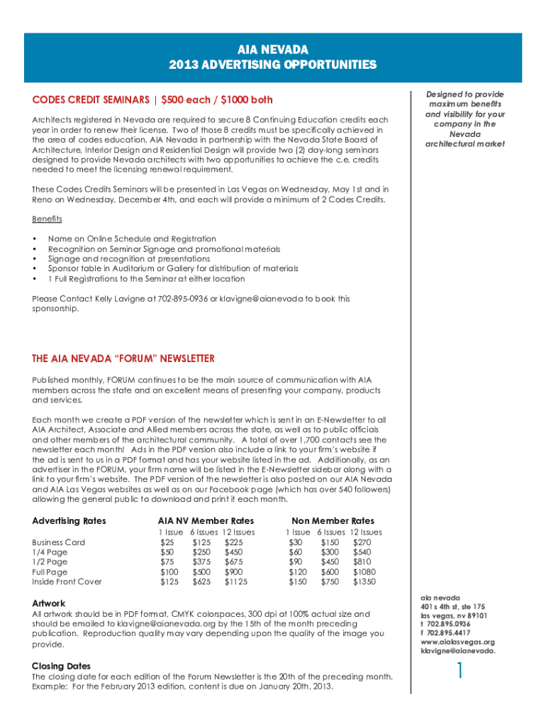 AIR NEVADA 2013 ADVERTISING OPPORTUNITIES CODES CREDIT SEMINARS $500 each / $1000 both Architects registered in Nevada are required to secure 8 Continuing Education credits each year in order to renew