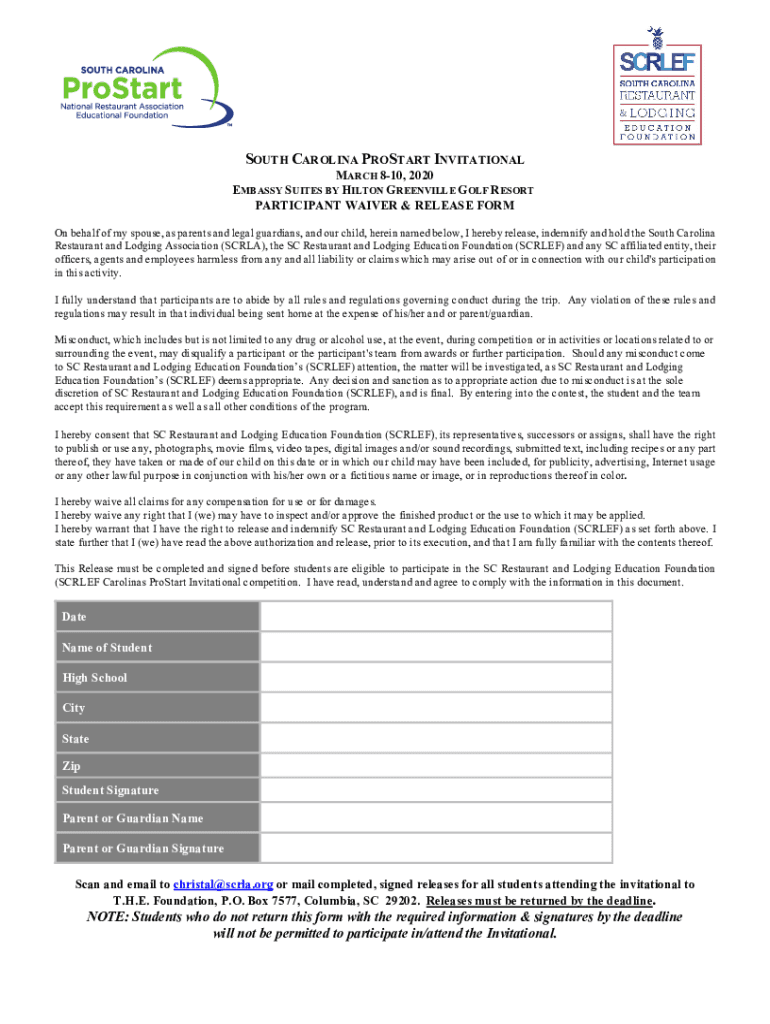 SOUTH CAROLINA PROSTATE INVITATIONAL MARCH 810, 2020 EMBASSY SUITES BY HILTON GREENVILLE GOLF RESORT PARTICIPANT WAIVER & RELEASE FORM On behalf of my spouse, as parents and legal guardians, and our
