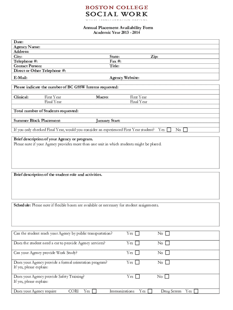 Get the free Boston College Graduate School of Social Work Annual Placement Availability. Applica...