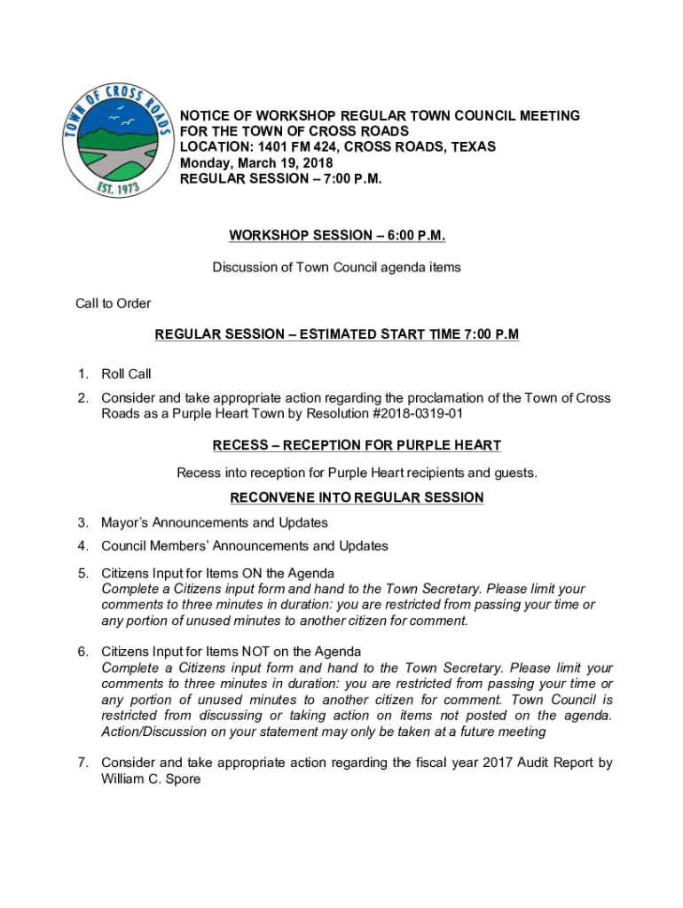 NOTICE OF WORKSHOP REGULAR TOWN COUNCIL MEETING FOR THE TOWN OF CROSS ROADS LOCATION: 1401 FM 424, CROSS ROADS, TEXAS Monday, March 19, 2018, REGULAR SESSION 7:00 P.M.WORKSHOP SESSION 6:00 P.M. Discussion