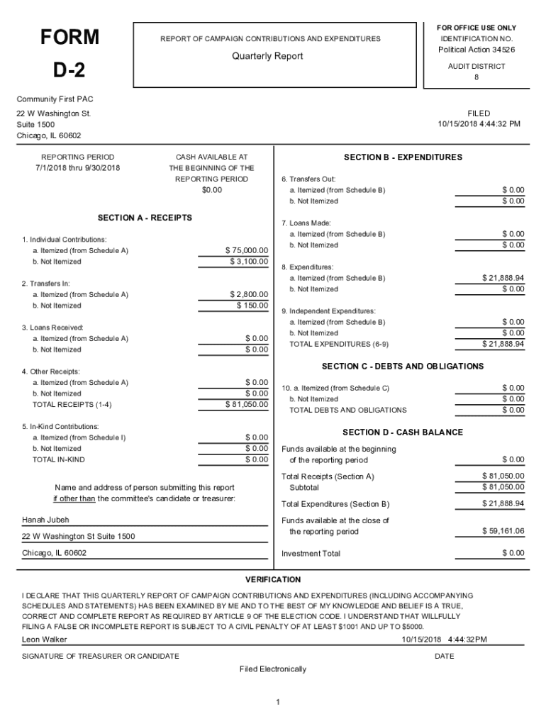 FORMER OFFICE USE OVERREPORT OF CAMPAIGN CONTRIBUTIONS AND EXPENDITURESIDENTIFICATION NO. Political Action 34526Quarterly ReportD2AUDIT DISTRICT8Community First PAC 22 W Washington St. Suite 1500