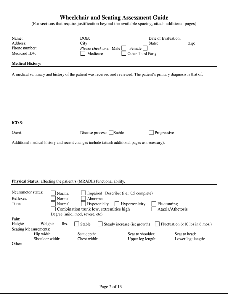 Wheelchair and seating assessments should be filled out by a qualified healthcare professional such as an occupational therapist or physical therapist.