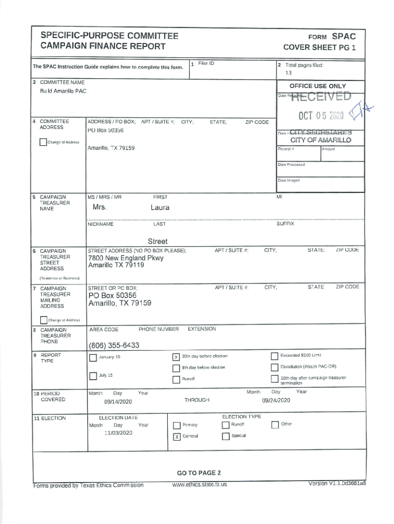 SPECIFICPURPOSE COMMITTEEformCAMPAIGN FINANCE REPORTSPACCOVER SHEET PG 1