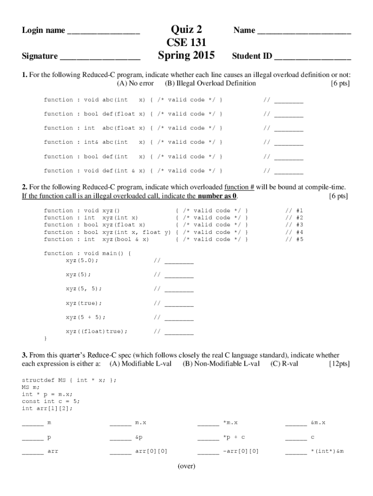 Login name Signature Quiz 2 CSE 131 Spring 2015Name Student ID 1. For the following Reduced program, indicate whether each line causes an illegal overload definition or not: (A) No error (B) Illegal