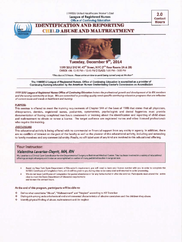 1199SEIU United Healthcare Worker's Rasalhague of Registered Nurses Office of Continuing EducationIDENTIFICATION AND REPORTING C IUD.ABUSE AND MALTRFlTMENTTuesday,2. Contact Hours20141199 SEU 310