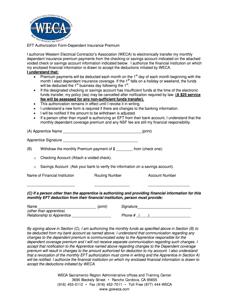 The EFT Authorization Form for Dependent Insurance Premium is essential for apprentices who wish to authorize the Western Electrical Contractor’s Association (WECA) to handle their dependent insurance premium payments through electronic funds transfer. This form simplifies the payment process, ensuring that premiums are paid timely directly from the apprentice's bank account.