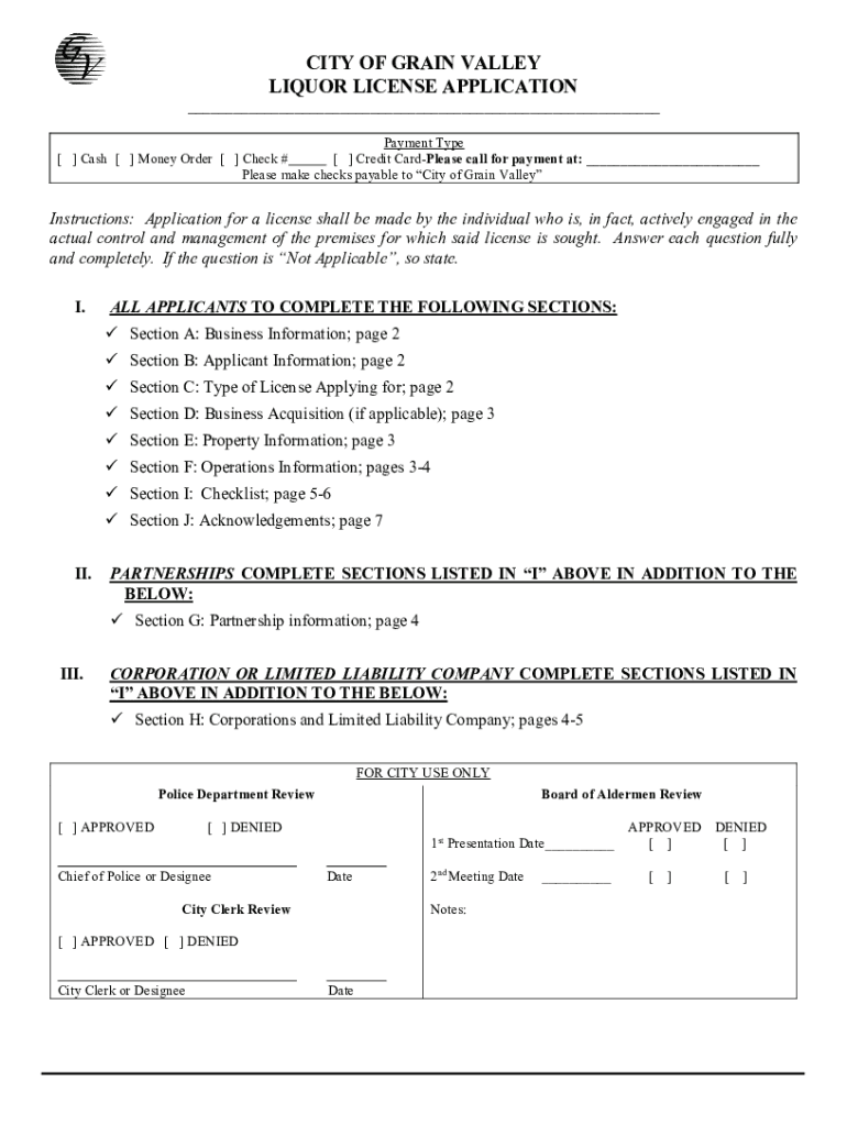 CITY OF GRAIN VALLEY LIQUOR LICENSE APPLICATION Payment Type Cash Money Order Check # Credit CardPlease call for payment at: Please make checks payable to City of Grain ValleyInstructions: Application