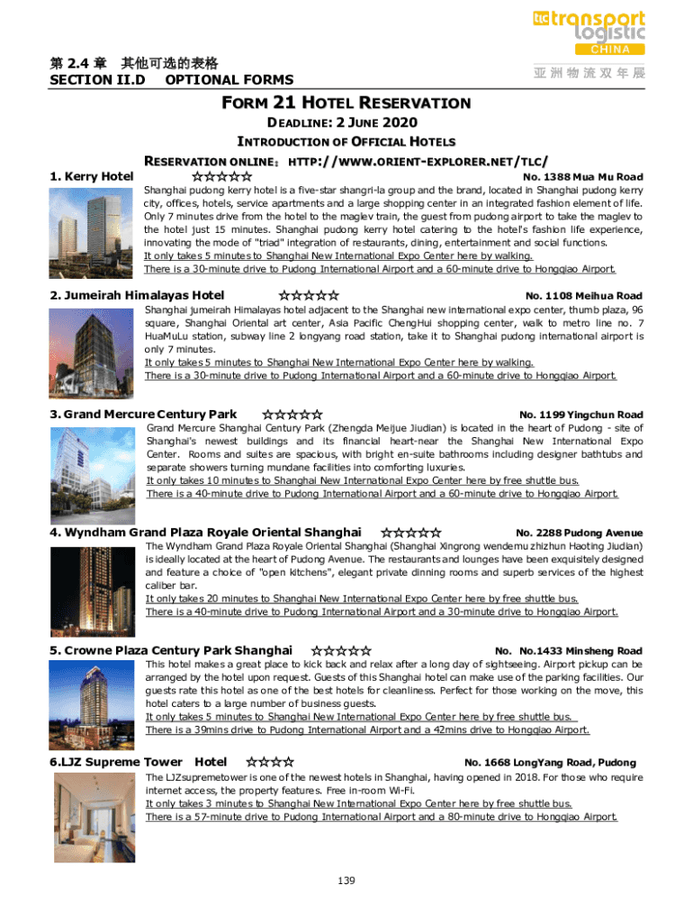 2.4 SECTION II. D OPTIONAL FORESHORE 21 HOTEL RESERVATION1. Kerry HotelDEADLINE: 2 JUNE 2020 INTRODUCTION OF OFFICIAL HOTELS RESERVATION ONLINE HTTP://WWW.ORIENTEXPLORER.NET/TLC/ No. 1388 MA Mu Road