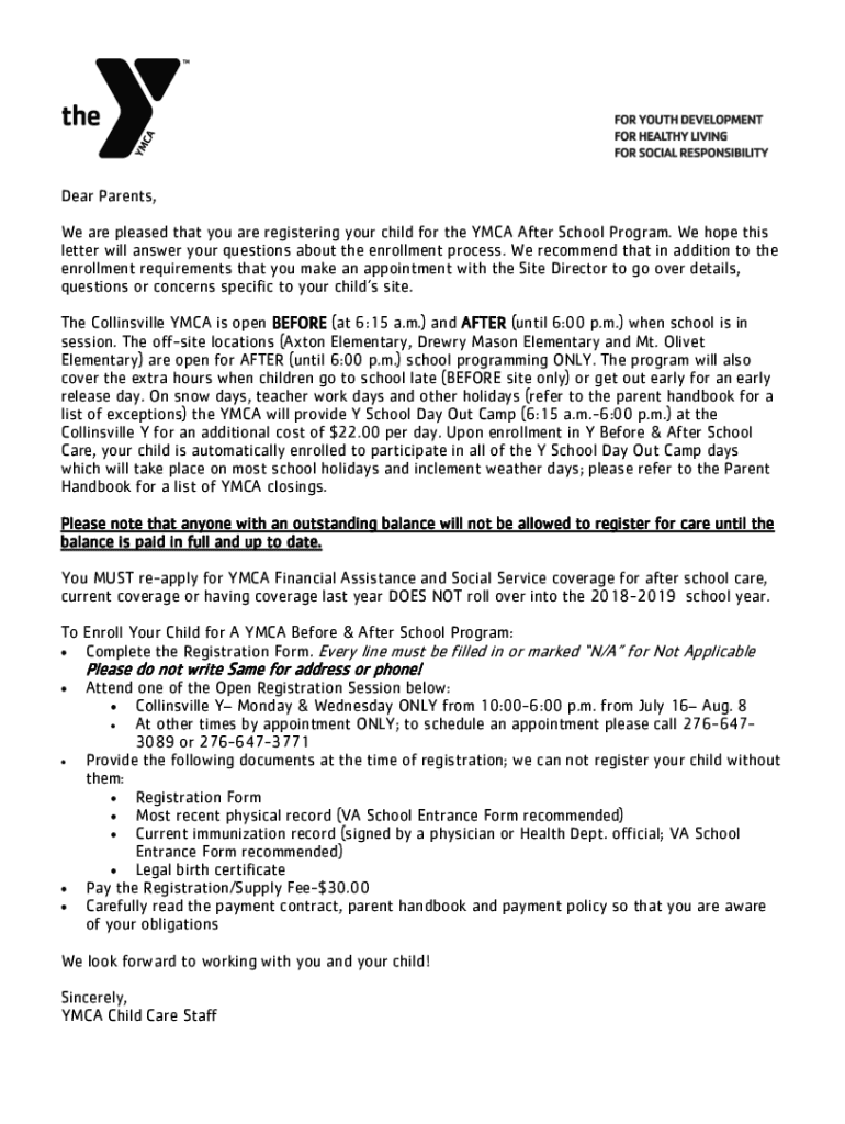 We are pleased that you are registering your child for the YMCA After School Program. We hope this