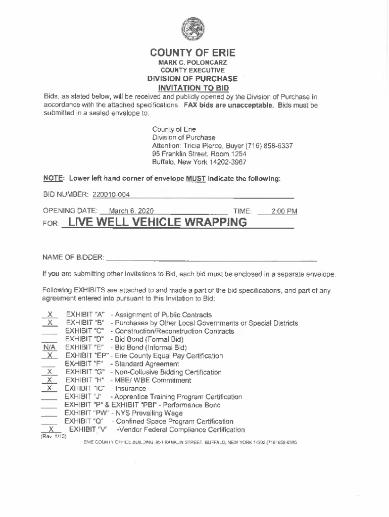 COUNTY OF ERIE MARK C. POINCARE COUNTY EXECUTIVEDIVISION OF PURCHASE INVITATION TO BID Bids, as stated below, will be received and publicly opened by the Division of Purchase in accordance with the