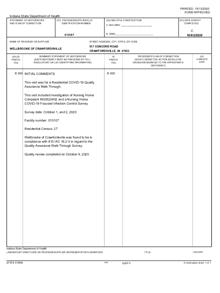Get the free Indiana State Department of Health 10/02/2020 CR 000 ... - IN.gov