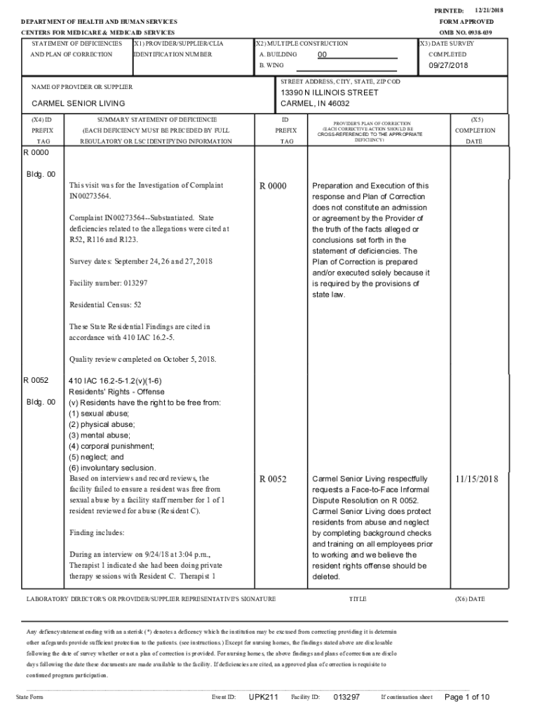 12/21/2018PRINTED: DEPARTMENT OF HEALTH AND HUMAN SERVICESFORM APPROVEDCENTERS FOR MEDICARE & MEDICAID SERVICES STATEMENT OF DEFICIENCIES(X1) PROVIDER/SUPPLIER/LIGAND PLAN OF CORRECTIONIDENTIFICATION