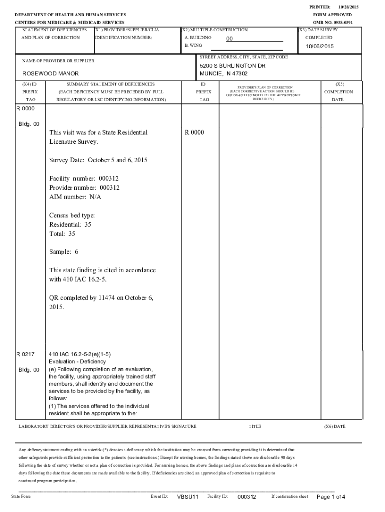 PRINTED: DEPARTMENT OF HEALTH AND HUMAN SERVICES CENTERS FOR MEDICARE & MEDICAID SERVICES STATEMENT OF DEFICIENCIES(X1) PROVIDER/SUPPLIER/LIGAND PLAN OF CORRECTIONIDENTIFICATION NUMBER:10/28/2015FORM