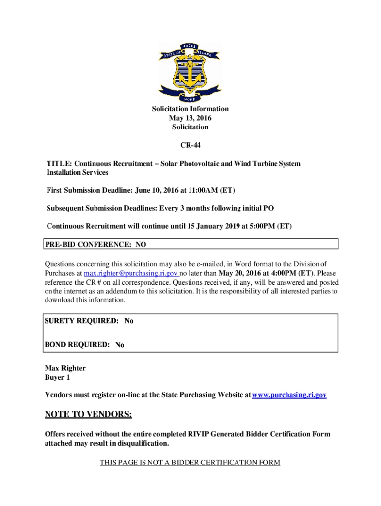Solicitation Information May 13, 2016, Solicitation CR44 TITLE: Continuous Recruitment Solar Photovoltaic and Wind Turbine System Installation Services First Submission Deadline: June 10, 2016, at