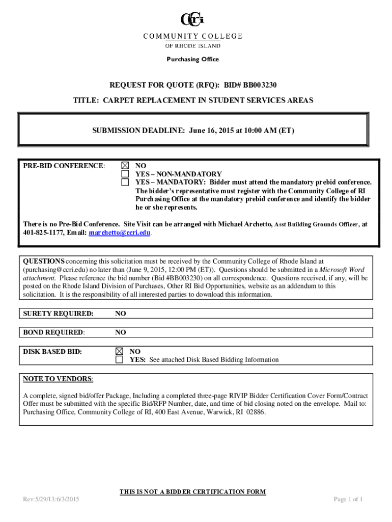 Purchasing OfficeREQUEST FOR QUOTE (RFQ): BID# BB003230 TITLE: CARPET REPLACEMENT IN STUDENT SERVICES AREAS SUBMISSION DEADLINE: June 16, 2015, at 10:00 AM (ET)PREBID CONFERENCE:NO YES NONMANDATORY