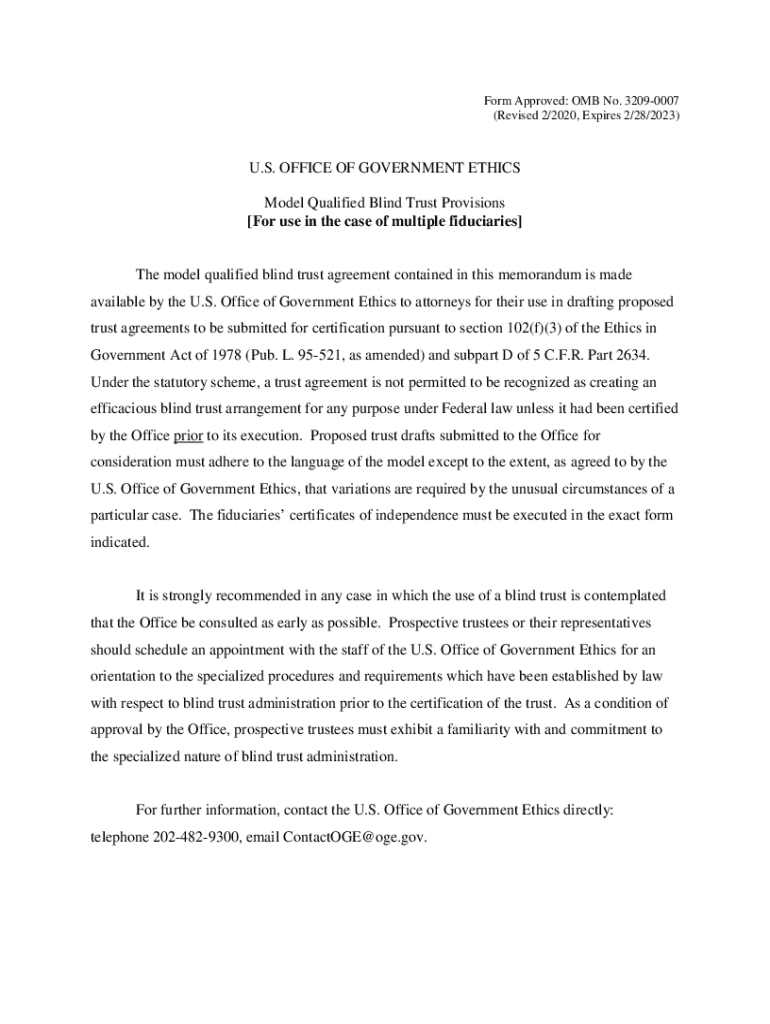 Form Approved: OMB No. 32090007 (Revised 2/2020, Expires 2/28/2023)U.S. OFFICE OF GOVERNMENT ETHICS Model Qualified Blind Trust Provisions For use in the case of multiple fiduciaries The model qualified