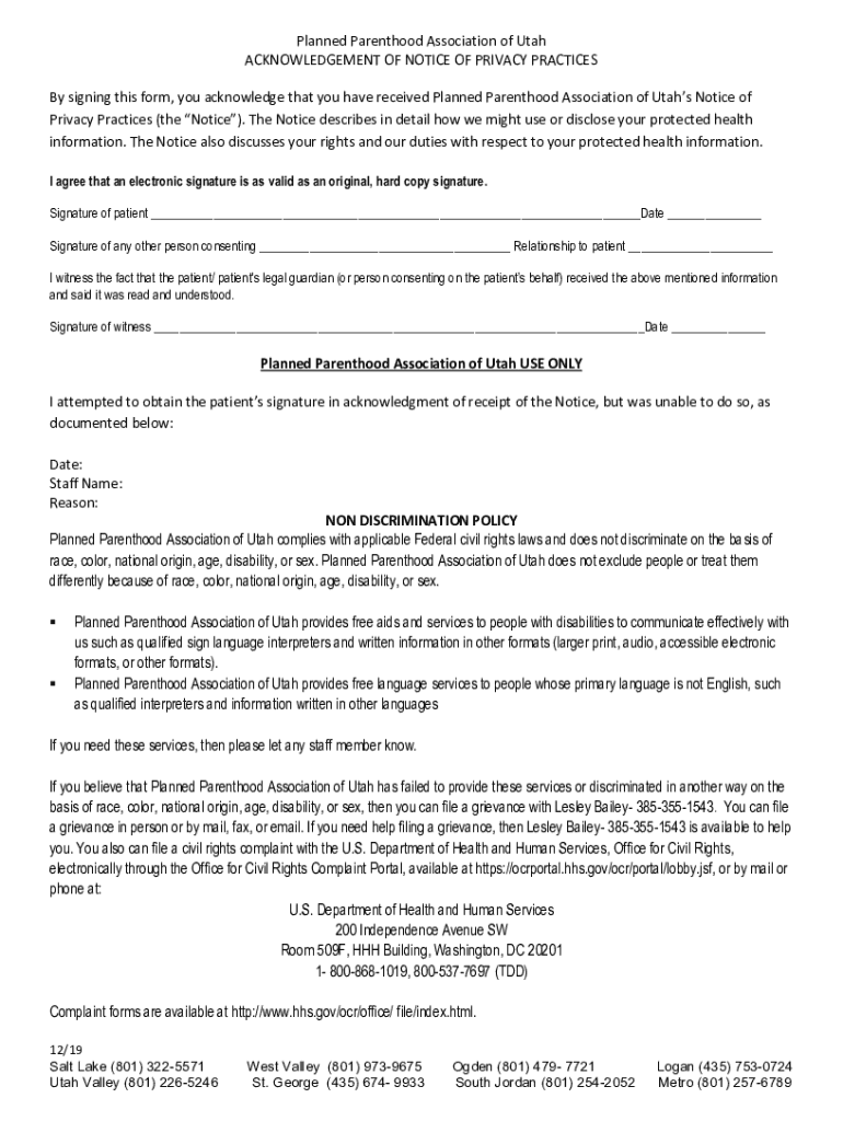By signing this form, you acknowledge that you have received Planned Parenthood Association of Utah's Notice of
