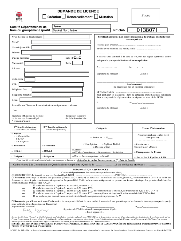 DEMAND DE License Creation Renouvellement Mutation l 'Ire Comic Departmental DE Not Du procurement sport if Basket Word IsrePhotoN club DE license (is DJ license)0138071Certificat annual DE nonvoter