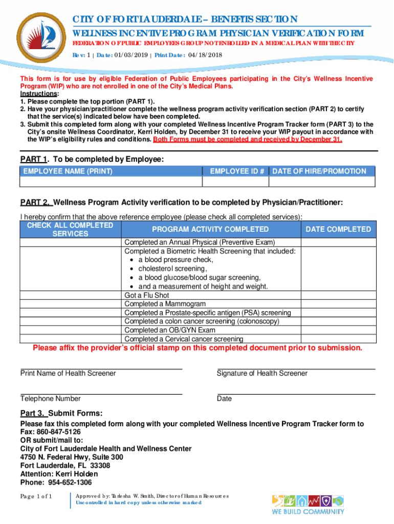 CITY OF FORT LAUDERDALE BENEFITS SECTIONWELLNESS INCENTIVE PROGRAM PHYSICIAN VERIFICATION FORM FEDERATION OF PUBLIC EMPLOYEES GROUP NOT ENROLLED IN A MEDICAL PLAN WITH THE CITY Rev: 1 Date: 01/03/2019